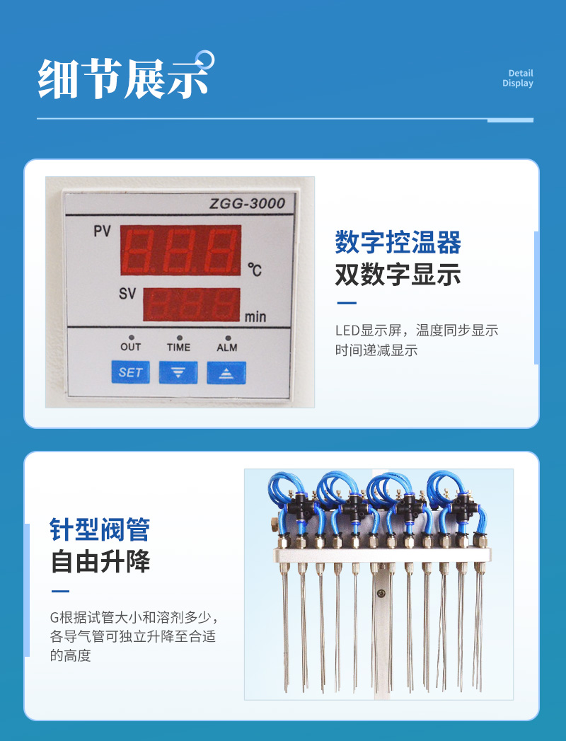 3、氮吹儀有36個氣道控制開關,節約氣體,每根吹氣針的位置可獨立改變吹掃位置,使之適用不同的樣品容器及不同的樣品位置