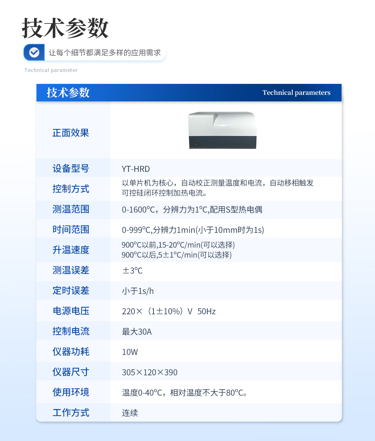 | 1、控制方式:以單片機為核心,自動校正測量溫度和電流,自動移相觸發可控硅閉環控制加熱電流。 | 2、測溫范圍:0-1600oC,分辨力為1oC,配用S型熱電偶. | 3、時間范圍:0-999oC,分辨力1min(小于10mm時為1s) | 4、升溫速度:900oC以前,15-20oC/min(可以選擇).900oC以后,5±1oC/min(可以選擇) | 5、測溫誤差:±3oC | 6、定時誤差:小于1s/h | 7、電源電壓:220×(1±10%)V 50Hz | 8、控制電流:**30A | 9、儀器功耗:10W | 10儀器尺寸(mm):305×120×390 | 11、使用環境:溫度0-40oC,相對溫度不大于80oC | 12、工作方式:連續 |