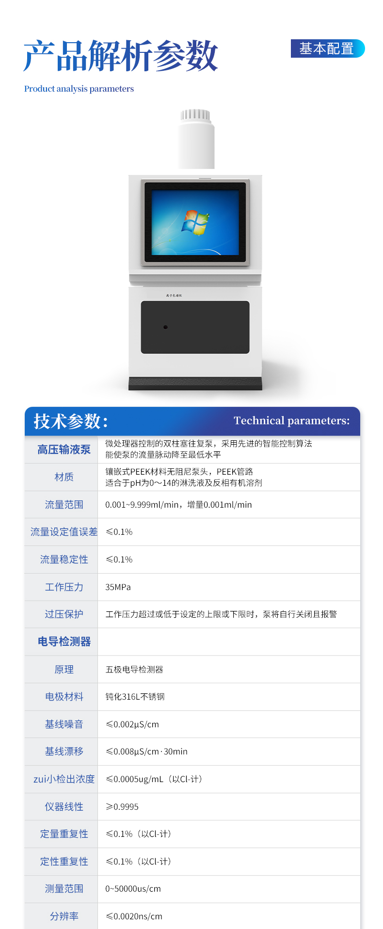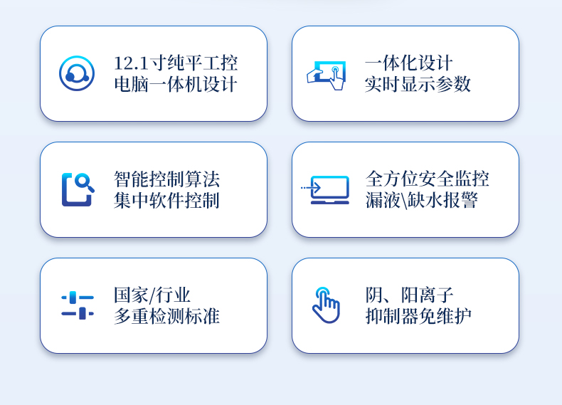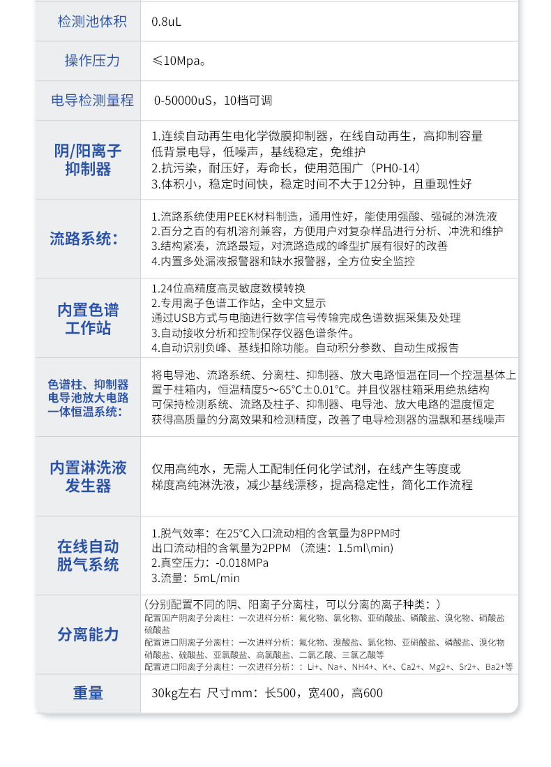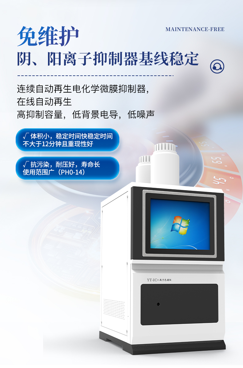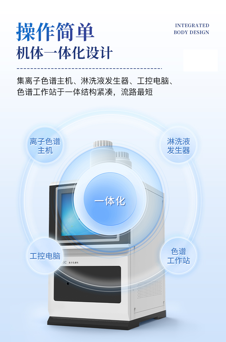 | 我們公司作為離子色譜儀器市場(chǎng)的新業(yè)態(tài),一直致力于為用戶提供更快捷、優(yōu)質(zhì)的儀器,以保障實(shí)驗(yàn)室的建設(shè)和運(yùn)行。始終堅(jiān)持以客戶為中心,為有檢測(cè)需求的客戶服務(wù)。物美價(jià)廉、響應(yīng)迅捷、服務(wù)全面。 | 全新一代離子色譜儀,采用12.1吋純平工控電腦一體機(jī)設(shè)計(jì)(用戶不需要配電腦),實(shí)時(shí)顯示儀器運(yùn)行參數(shù)和狀態(tài);一鍵啟動(dòng)電動(dòng)閥進(jìn)樣,一鍵完成儀器開關(guān)機(jī)、維護(hù)等操作,一鍵調(diào)閱儀器操作教程,方便快捷。 | 離子色譜儀核心零部件自主研發(fā)、自主知識(shí)產(chǎn)權(quán)可控。采用一體化設(shè)計(jì),集離子色譜主機(jī)、淋洗液發(fā)生器、工控電腦、色譜工作站于一體,結(jié)構(gòu)緊湊,流路*短,對(duì)流路造成的峰型擴(kuò)展有很好的改善。一體化恒溫箱:色譜柱、抑制器、電導(dǎo)池、放大電路都處于同一恒溫系統(tǒng),改善了電導(dǎo)檢測(cè)器的溫飄和基線噪聲。內(nèi)置多處漏液報(bào)警器和缺水報(bào)警器,全方位安全監(jiān)控。由PLC控制的各個(gè)部件統(tǒng)一到電腦顯示屏的集中軟件控制系統(tǒng),操作方便,鼠標(biāo)所見即所控。 |