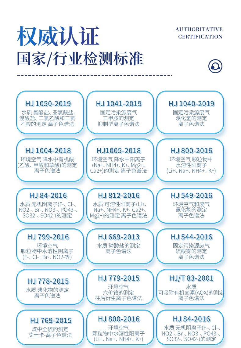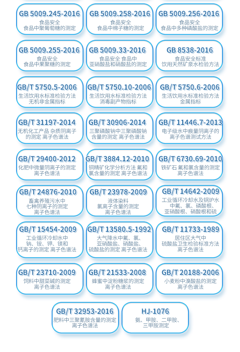 | HJ 1050-2019 水質(zhì) 氯酸鹽、亞氯酸鹽、溴酸鹽、二氯乙酸和三氯乙酸的測(cè)定 離子色譜法 | HJ 1041-2019 固定污染源廢氣 三甲胺的測(cè)定 抑制型離子色譜法 | HJ 1040-2019 固定污染源廢氣 溴化氫的測(cè)定 離子色譜法 | HJ 1004-2018 環(huán)境空氣 降水中有機(jī)酸(乙酸、甲酸和草酸)的測(cè)定 離子色譜法 | HJ1005-2018 環(huán)境空氣 降水中陽離子(Na+、NH4+、K+、Mg2+、Ca2+)的測(cè)定 離子色譜法 | HJ 800-2016 環(huán)境空氣 顆粒物中水溶性陽離子(Li+、Na+、NH4+、K+) | HJ 84-2016 水質(zhì) 無機(jī)陰離子(F-、Cl-、NO2-、Br-、NO3-、PO43-、SO32-、SO42-)的測(cè)定 | HJ 812-2016 水質(zhì) 可溶性陽離子(Li+、Na+、NH4+、K+、Ca2+、Mg2+)的測(cè)定 離子色譜法 | HJ 549-2016 環(huán)境空氣和廢氣 氯化氫的測(cè)定 離子色譜法 | HJ 799-2016 環(huán)境空氣 顆粒物中水溶性陰離子(F-、Cl-、Br-、NO2-等) | HJ 669-2013 水質(zhì) 磷酸鹽的測(cè)定 離子色譜法 | HJ 544-2016 固定污染源廢氣 硫酸霧的測(cè)定 離子色譜法 | HJ 778-2015 水質(zhì) 碘化物的測(cè)定 離子色譜法 | HJ 779-2015 環(huán)境空氣 六價(jià)鉻的測(cè)定 柱后衍生離子色譜法 | HJ/T 83-2001 水質(zhì) 可吸附有機(jī)鹵素(AOX)的測(cè)定 離子色譜法 | HJ 769-2015 煤中全硫的測(cè)定 艾士卡-離子色譜法 | HJ 800-2016 環(huán)境空氣 顆粒物中水溶性陽離子(Li+、Na+、NH4+、K+) | HJ 84-2016 水質(zhì) 無機(jī)陰離子(F-、Cl-、NO2-、Br-、NO3-、PO43-、SO32-、SO42-)的測(cè)定 | GB 5009.245-2016 食品安全 食品中聚葡萄糖的測(cè)定 | GB 5009.258-2016 食品安全 食品中棉子糖的測(cè)定 | GB 5009.256-2016 食品安全 食品中多種磷酸鹽的測(cè)定 | GB 5009.255-2016 食品安全 食品中果聚糖的測(cè)定 | GB 5009.33-2016 食品安全 食品中亞硝酸鹽和硝酸鹽的測(cè)定 | GB 8538-2016 食品安全標(biāo)準(zhǔn) 飲用天然礦泉水檢驗(yàn)方法 | GB/T 5750.5-2006 生活飲用水標(biāo)準(zhǔn)檢驗(yàn)方法 無機(jī)非金屬指標(biāo) | GB/T 5750.10-2006 生活飲用水標(biāo)準(zhǔn)檢驗(yàn)方法 消毒副產(chǎn)物指標(biāo) | GB/T 5750.6-2006 生活飲用水標(biāo)準(zhǔn)檢驗(yàn)方法 金屬指標(biāo) | GB/T 31197-2014 無機(jī)化工產(chǎn)品 雜質(zhì)陰離子的測(cè)定 離子色譜法 | GB/T 30906-2014 三聚磷酸鈉中三聚磷酸鈉含量的測(cè)定 離子色譜法 | GB/T 11446.7-2013 電子級(jí)水中痕量陰離子的離子色譜測(cè)試方法 | GB/T 29400-2012 化肥中微量陰離子的測(cè)定 離子色譜法 | GB/T 3884.12-2010 銅精礦化學(xué)分析方法 第12部分:氟和氯含量的測(cè)定 離子色譜法 | GB/T 6730.69-2010 鐵礦石 氟和氯含量的測(cè)定 離子色譜法 | GB/T 24876-2010 畜禽養(yǎng)殖污水中七種陰離子的測(cè)定 離子色譜法 | GB/T 23978-2009 液體染料 氯離子含量的測(cè)定 離子色譜法 | GB/T 14642-2009 工業(yè)循環(huán)冷卻水及鍋爐水中氟、氯、磷酸根、亞硝酸根、硝酸根和硫 | GB/T 15454-2009 工業(yè)循環(huán)冷卻水中鈉、銨、鉀、鎂和鈣離子的測(cè)定 離子色譜法 | GB/T 23710-2009 飼料中甜菜堿的測(cè)定 離子色譜法 | GB/T 21533-2008 蜂蜜中淀粉糖漿的測(cè)定 離子色譜法 | GB/T 20188-2006 小麥粉中溴酸鹽的測(cè)定 離子色譜法 | GB/T 13580.5-1992 大氣降水中氟、氯、亞硝酸鹽、硝酸鹽、硫酸鹽的測(cè)定 離子色譜法 | GB/T 32953-2016 肥料中三聚氰胺含量的測(cè)定 離子色譜法 | GB/T 11733-1989 居住區(qū)大氣中硫酸鹽衛(wèi)生檢驗(yàn)標(biāo)準(zhǔn)方法 離子色譜法 | HJ-1076 氨、甲胺、二甲胺、三甲胺測(cè)定 |