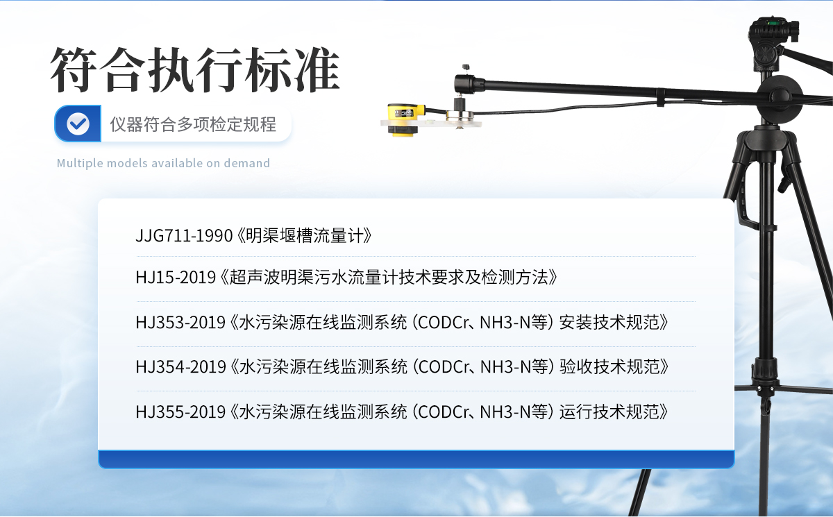 JJG 711-1990 《明渠堰槽流量計》 ZJJ-LR-01-2022《超聲波明渠流量計試行檢定規程》 HJ 15-2019 《超聲波明渠污水流量計技術要求及檢測方法》 HJ 353-2019 《水污染源在線監測系統(CODCr、NH3-N等)安裝技術規范》 HJ 354-2019 《水污染源在線監測系統(CODCr、NH3-N 等)驗收技術規范》 HJ 355-2019 《水污染源在線監測系統(CODCr、NH3-N等)運行技術規范》
