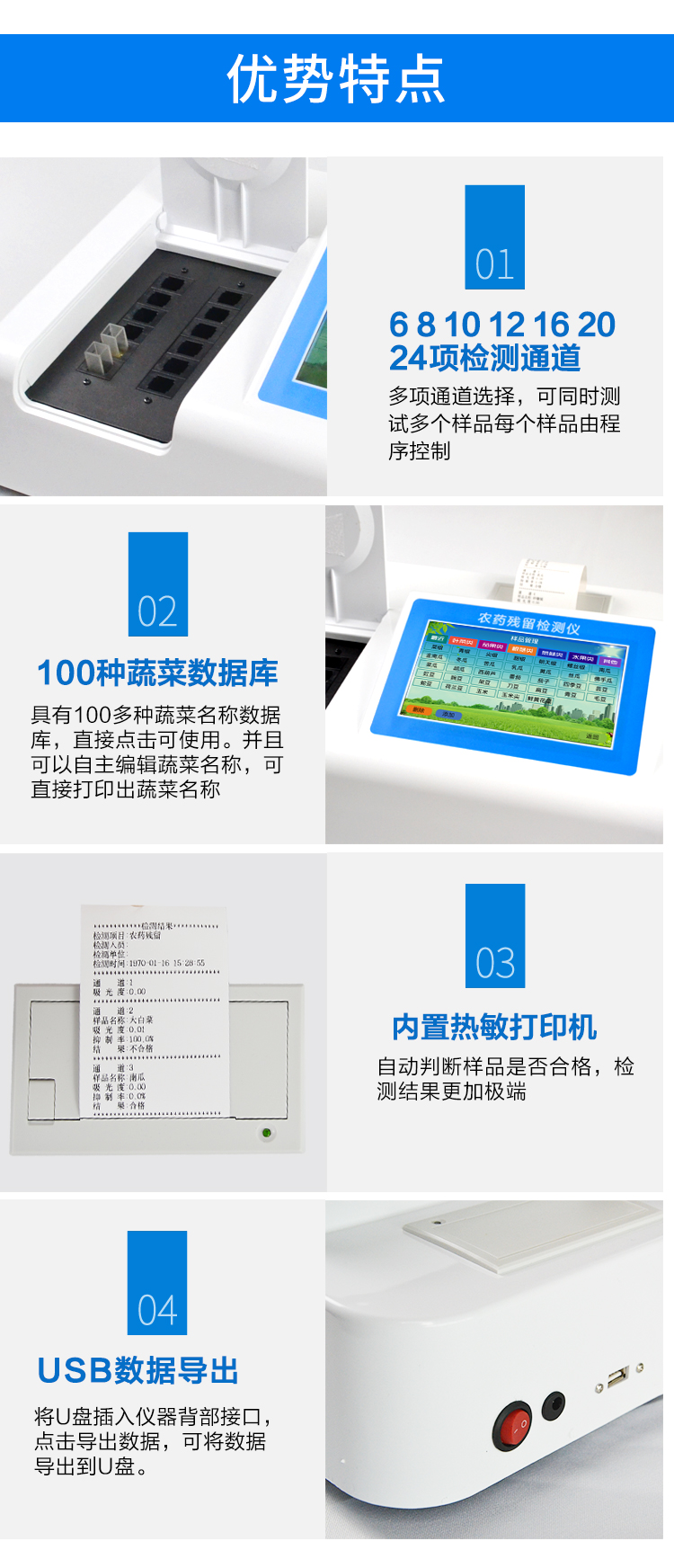 | 乙酰膽堿酯酶和丁酰膽堿酯酶試劑均可以使用,符合國家標準和農業部標準的要求。 | 自動判斷樣品是否合格,檢測結果更加直觀。 | 儀器具有100多種蔬菜名稱菜單庫,分類管理,并可按需添加或刪除蔬菜名,編輯蔬菜名稱,可直接打印出蔬菜名稱。 | 檢測通道:10個檢測通道,可以同時測試多個樣品,循環檢測,即放即檢,每個樣品由程序控制分別獨立工作,不會互相干擾。 | 智能操作系統,采用更加人性化操作,主控采用多核處理器,主頻1.88Ghz,運轉速度更快速,穩定性更強。 | 顯示方式:7英寸高靈敏真彩觸摸屏顯示,人性化中文操作界面,讀數直觀、簡單。 | 打印機采用串口5v打印,可選擇手動打印或者自動打印,三分鐘出打印結果,打印格式為檢測人姓名、吸光度差值、檢測時間、檢測機構、樣品名稱及結果判定。 | 光源采用進口超高亮發光二極管,具有低功耗、高精度、穩定性強、光源可控可以關掉不使用的光源,響應速度快等優點。 | 智能恒流穩壓,光強自動校準,長時間連續工作光源無溫漂現象。 | 儀器具有GPRS遠傳功能,可插手機卡實現數據遠傳平臺,wifi聯網功能,可將數據快速上傳電腦,進行數據管理與統計。 | 采用USB2.0接口設計,方便數據的存貯和移動,并可隨時與計算機直接相連,并且可用計算機控制儀器。實現數據查詢、瀏覽、分析、統計、打印等。 | 智能化程度高,儀器具有自檢功能:具有開機自檢和調零功能,具有自動檢測重復性功能 | 儀器具有自身保護功能,可設置用戶名及密碼,防止非工作人員操作等。 | 采用DC12v直流供電,安全系統更高,并且配備6A鋰電池充電器。 | 儀器具有重新校準、鎖定、恢復出廠設置功能。 |