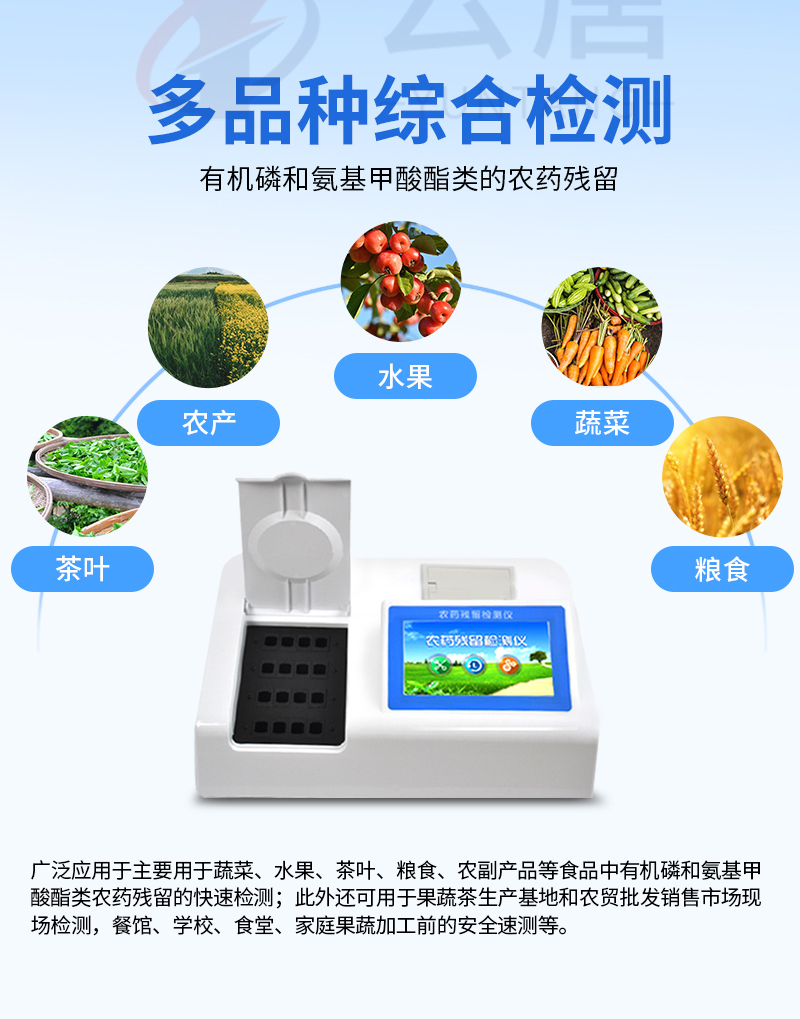 廣泛應用于主要用于蔬菜、水果、茶葉、糧食、農副產品等食品中有機磷和氨基甲酸酯類農藥殘留的快速檢測;此外還可用于果蔬茶生產基地和農貿批發銷售市場現場檢測,餐館、學校、食堂、家庭果蔬加工前的安全速測等。