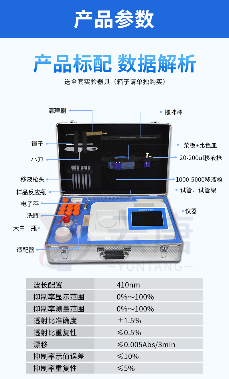 檢測標準:依據國家標準方法(GB/T5009.199-2003)以及世界衛生組織WHO、世界糧農組織FAO殘留農藥檢測標準、世界環境保護局EPA參照攝入量等要求來設計。采用酶抑制率比色法對水果、蔬菜等農林產品中有機磷和氨基甲酸酯類農藥含量進行快速準確的檢測,乙酰膽堿酯酶和丁酰膽堿酯酶試劑均可以使用,符合國家標準和農業部標準的要求。