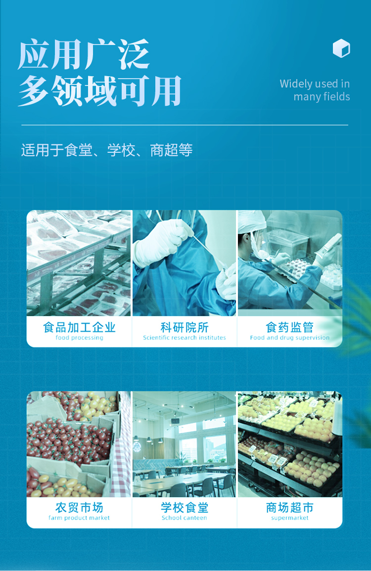 廣泛應用于主要用于蔬菜、水果、茶葉、糧食、農副產品等食品中有機磷和氨基甲酸酯類農藥殘留的快速檢測;此外還可用于果蔬茶生產基地和農貿批發銷售市場現場檢測,餐館、學校、食堂、家庭果蔬加工前的安全速測等。
