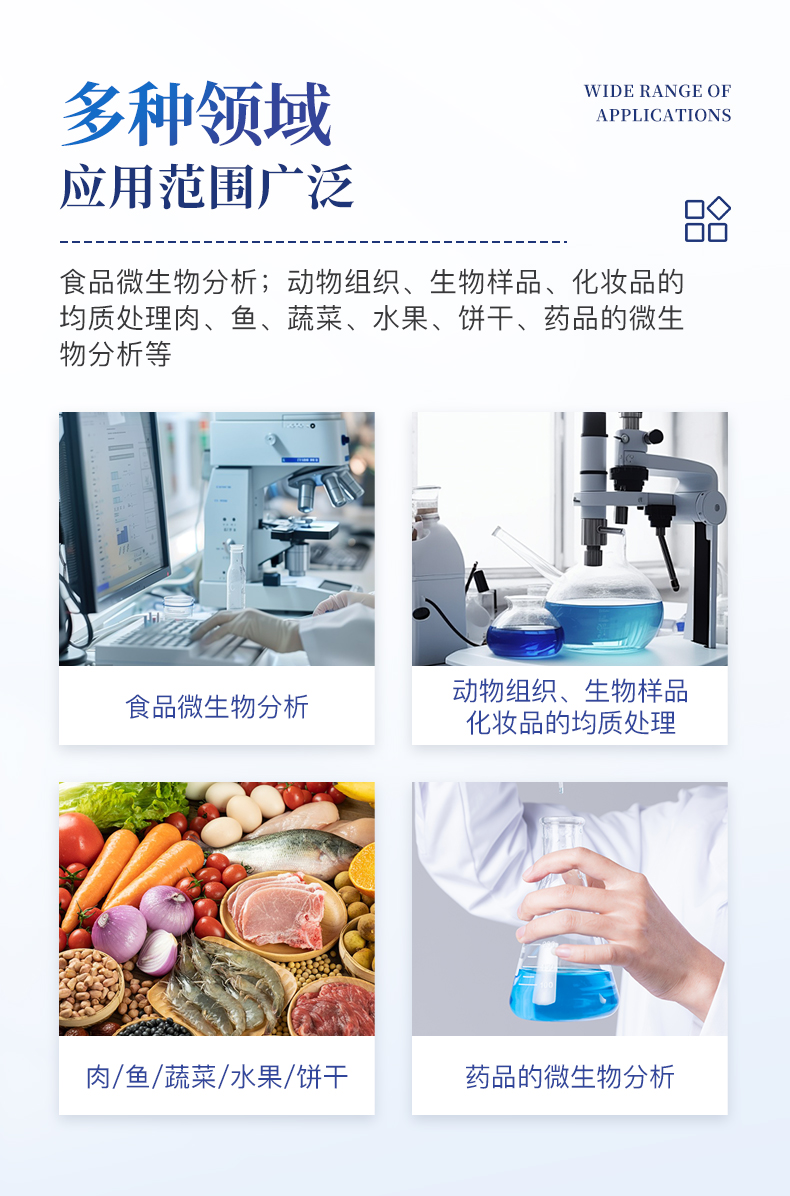 應用領域:食品微生物分析;動物組織、生物樣品、化妝品的均質處理;肉、魚、蔬菜、水果、餅干;藥品的微生物分析等;