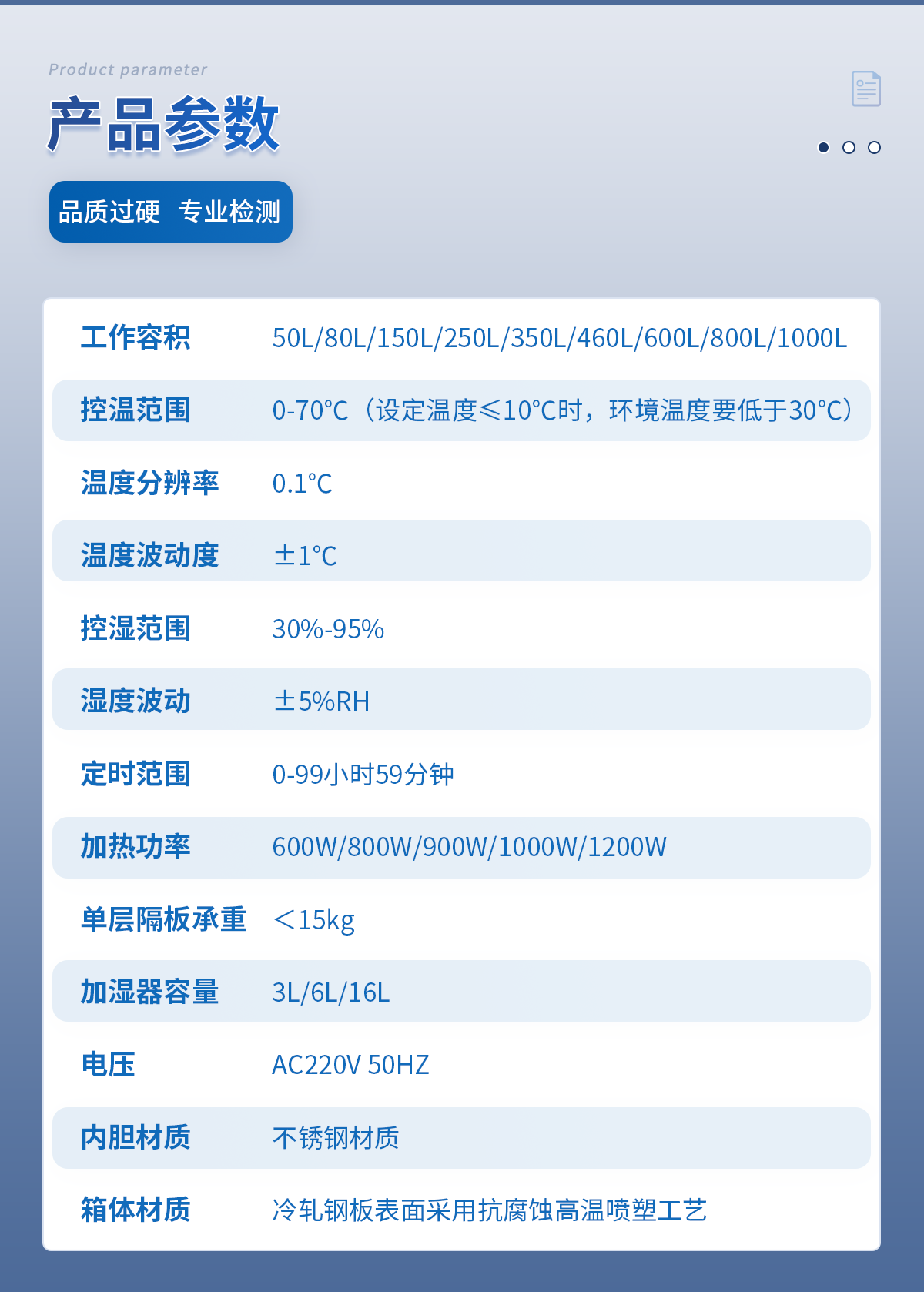 工作容積:360L控溫范圍:0-70℃(設定溫度≤10℃時,環境溫度要低于30℃)程序控制:24段溫度分辨率:0.1℃溫度波動度:±0.5℃控濕范圍:30%-95%濕度波動:±5%RH定時范圍:0-99小時59分鐘加熱功率:900W內箱尺寸 寬*深*高(cm):60*60*100外箱尺寸 寬*深*高(cm):77*84*162隔板層數(標配):2層層間隔/mm:43卡槽層數:15加濕器容量(標配):3L單層隔板承重:<22kg底部總承重:35kg電壓:AC220V 50HZ整機重量:112kg內膽材質:8K鏡面不銹鋼箱體材質:冷軋鋼板表面采用抗腐蝕高溫噴塑工藝旗艦款升級項目:升級內置鋼化玻璃門,內置220V電源插座。
