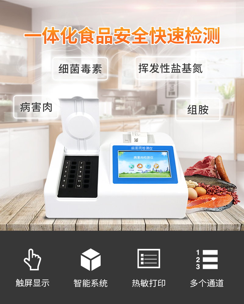 可快速檢測病害肉、組胺、揮發性鹽基氮,儀器預留其他項目檢測程序和端口,根據日后需求可方便的自主增加檢測項目。