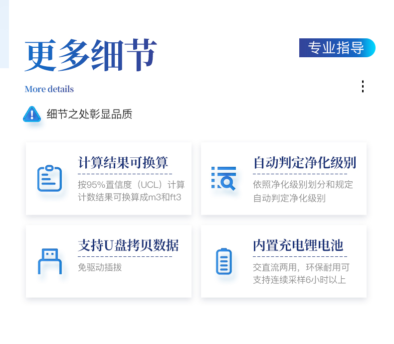 1、安卓系統(tǒng)7.1版本,操作交互體驗更好。 2、內置溫濕度傳感器、環(huán)境氣壓傳感器 3、核心部件光散射傳感器明顯消除腔體的雜散光,信噪比大為提高。從而使測量更準確更可靠。 4、按95%置信度(UCL)計算,計數(shù)結果可換算成m3和ft3 5、依照凈化級別劃分和規(guī)定,自動判定凈化級別,使用便利。 6、帶審計追蹤功能,可查詢、可追溯、可控制,符合FDA 21CFR PART11規(guī)范 7、支持wifi、藍牙傳輸,數(shù)據可無線上傳;同時支持U盤拷貝數(shù)據,免驅動插拔。 8、配置監(jiān)管平臺,檢測結果可直接無線傳至平臺,進行潔凈度長短期分析,輔助管理。 9、內置新一代高速熱敏打印機,可選擇所需要打印的粒徑通道,靈活打印結果。 10、交直流兩用,內置充電鋰電池,環(huán)保耐用可支持連續(xù)采樣6小時以上。 11、便捷簡易伸縮式云臺支架,安裝采樣操作更加方便。