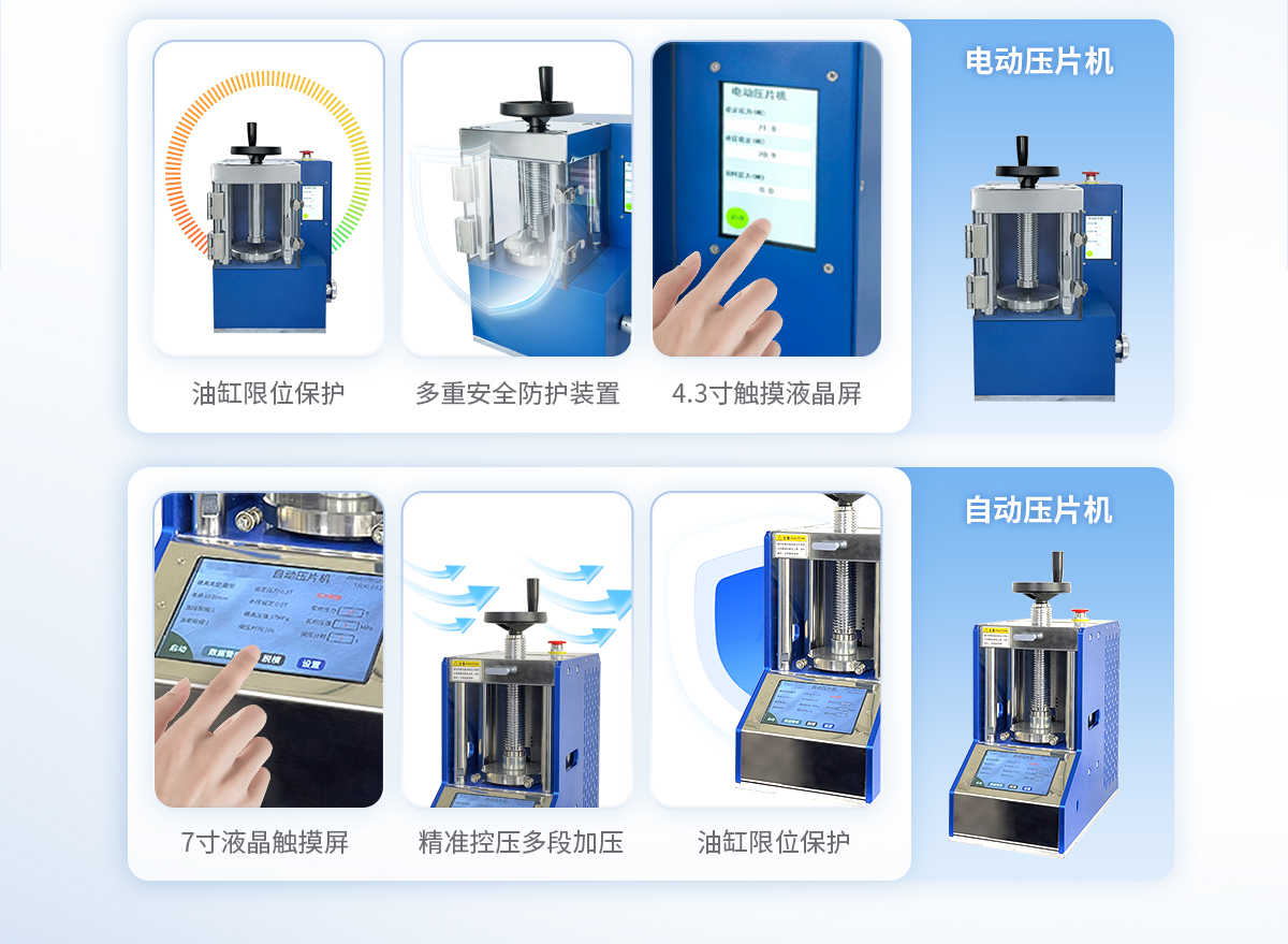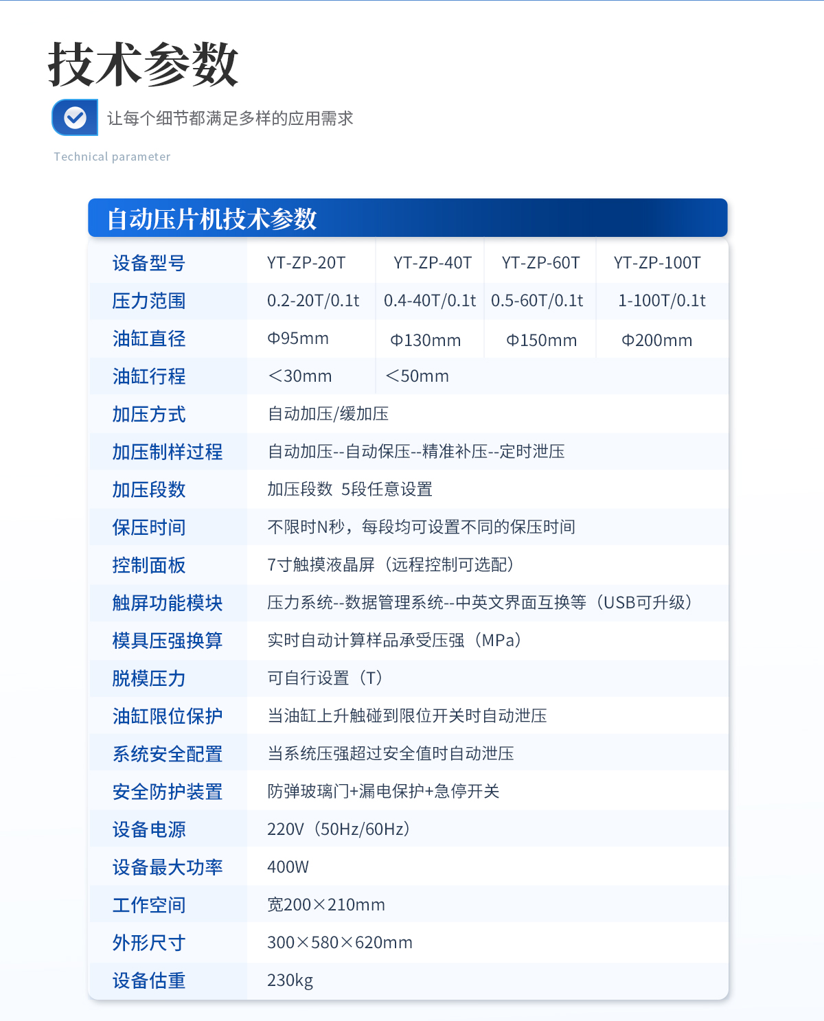 | 設備型號:YT-ZP-10TH | 壓力范圍:0.1-10T/0.1t | 壓力換算:自動 | 活塞直徑:Ф95mm | **活塞行程:<30mm | 壓力表類型:7寸 觸摸液晶屏 | 加泄壓方式:自動加壓/保壓/補壓/泄壓 | 保壓時間:不限時(N秒) | 模具壓強換算:程序自動換算 | 油缸限位保護:當油缸上升觸碰到限位開關時自動泄壓 | 系統安全配置:當系統壓強超過安全值時自動泄壓 | 安全防護配置:防彈玻璃門+漏電保護+急停開關 | 數據管理:壓力系統--數據管理系統--中英文界面互換等(USB可升級) | 設備電源:220V(50Hz/60Hz) | 工作臺直徑:Φ125mm | 工作空間:寬145×160mm | 外形尺寸:230×390×420mm | 設備重量:85kg | 配置說明:壓片機1臺,Φ13mm紅外模具1套,瑪瑙研缽1套,溴化鉀1瓶,樣品勺1個 (可拆液體池,紅外烤燈為選配) |