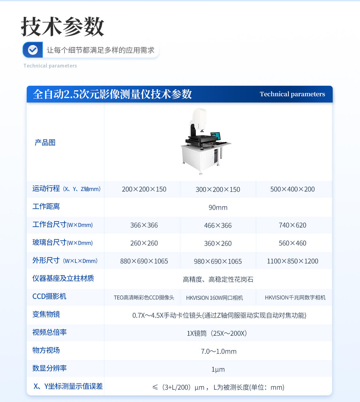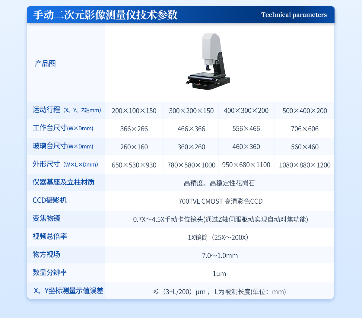 | 1.運動行程(X、Y、Z軸mm):200×200×150 | 2.工作距離:90mm | 3.工作臺呎寸(W×Dmm):366×366 | 4.玻璃臺呎寸(W×Dmm):260×260 | 5.外形尺寸(W×L×Dmm):880×690×1065 | 6.儀器基座及立柱材質:高精度、高穩定性花崗石 | 7.CCD攝影機:美國TEO高清晰彩色CCD攝像頭(或HKVISION網口相機) | 8.變焦物鏡: 0.7X~4.5X手動卡位鏡頭(通過Z軸伺服驅動實現自動對焦功能) | 9.視頻總倍率: 1X鏡筒(25X~200X) | 10.物方視場: 7.0~1.0mm | 11.數顯分辨率:1μm | 12.X、Y坐標測量示值誤差≤(3+L/200)μm , L為被測長度(單位:mm) | 13.作方式:XYZ三軸全自動伺服電機控制 +集成一體化運動控制設計 (只需對接220V電源接口、USB接口、AV視頻接口即可使用) | 14.測量軟件:INS全自動影像儀專用測量軟件 | 15.工作環境:溫度20±5 °C,濕度35%-75%(盡量滿足環境條件),如果溫濕度條件不能達到以上標準,至少要將儀器放置在少灰塵,少油氣,遠離振動源的室內。 |