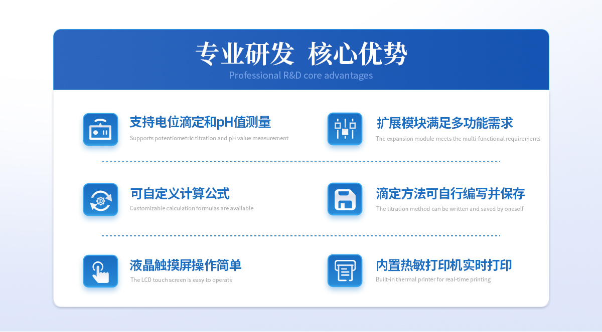 自動電位滴定儀是一種用于化學分析的精密儀器,他通過自動添加滴定劑來確定樣品中特定成分的濃度。該儀器基于電位滴定原理工作,即根據在滴定過程中電池電動勢的變化來確定滴定終點的一款滴定設備。設備滿足國家檢定規程JJG 814-2015《自動電位滴定儀》儀器級別中的0.05級別,即儀器**示值誤差為±1.5%,儀器示值重復性≤0.2%