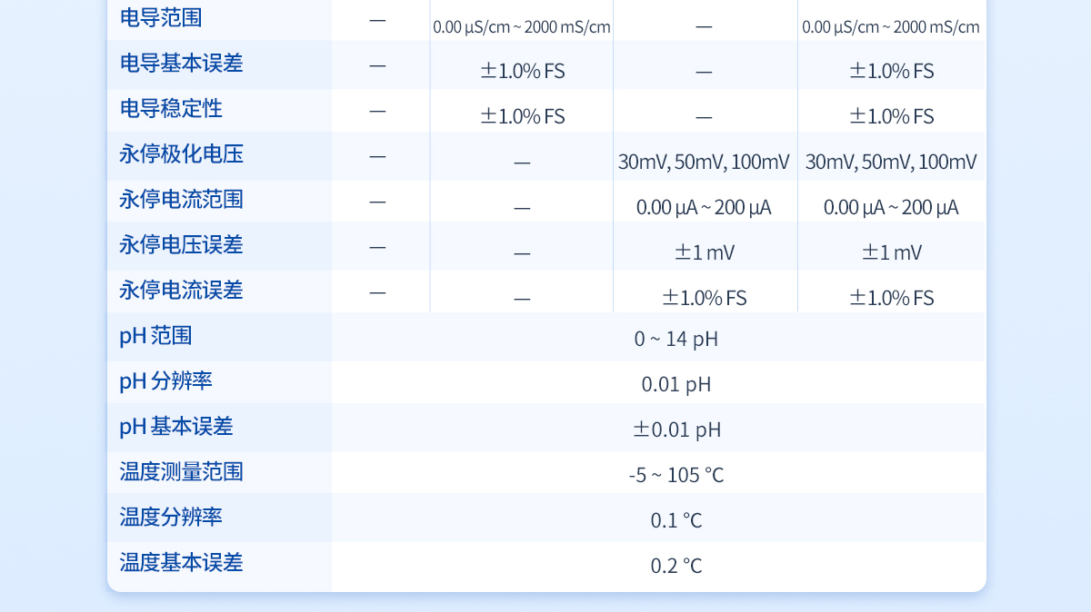 滴定分析重復性:≤0.2%滴定分析誤差:≤1.5%10mL滴定管滴定容量精度:±5μL20mL滴定管滴定容量精度:±10μL10mL滴定管滴定容量誤差:10μL/10mL20mL滴定管滴定容量誤差:20μL/10mL電位范圍:-2000—2000mV電位分辨率:0.1mV電位基本誤差mV:±0.25‰/FS電位穩定性mV:±0.3mV/3h電導范圍:0.00uS/cm-2000mS/cm電導基本誤差:±1.0% FS電導穩定性:±1.0% FSpH范圍:0-14PHpH分辨率:0.01PHpH基本誤差:±0.01PH溫度測量范圍:-5 - 105℃溫度分辨率:0.1℃溫度基本誤差:0.2℃